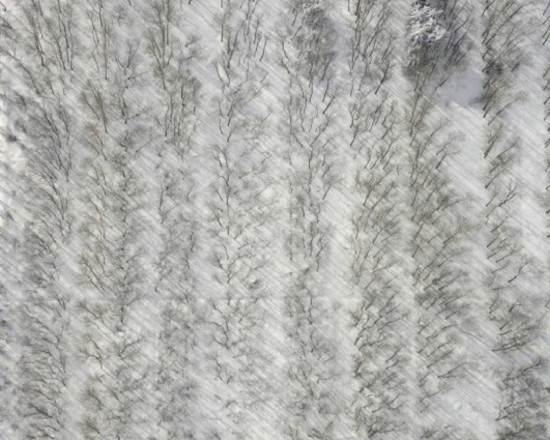 JP01-80 from Taiji Matsue’s photo book JP-01 SPK (AKAAKA, 2014) All images: © Taiji Matsue, courtesy the artist and Taro Nasu. The first 11 works in the photobook are all photos of forests. This is a motif that appears frequently in Matsue’s work, but because of the introduction of subtle differences in color due to the season, in the direction of light and shadow, and in the height from which they are taken, our sense of direction is gradually undermined: Is the camera angle horizontal or vertical? Are we looking at a scene directly in front of us or are we looking down on a scene below us? Where is the ground? This confusion comes to a head with the 12th photo (JP01-80), which shows what appears to be a dam directly in front of us but which is actually a lake formed by a dam covered in snow more or less directly below us, while the white Erman’s birches (multiple), the snowfield bathed in light (JP01-79), the photo in which the shadows of trees describe oblique lines on a snowfield, upsetting our sense of direction (JP01-71), and the autumnal forest that appears to be swirling (JP01-67) trifle with the viewer one after the other.