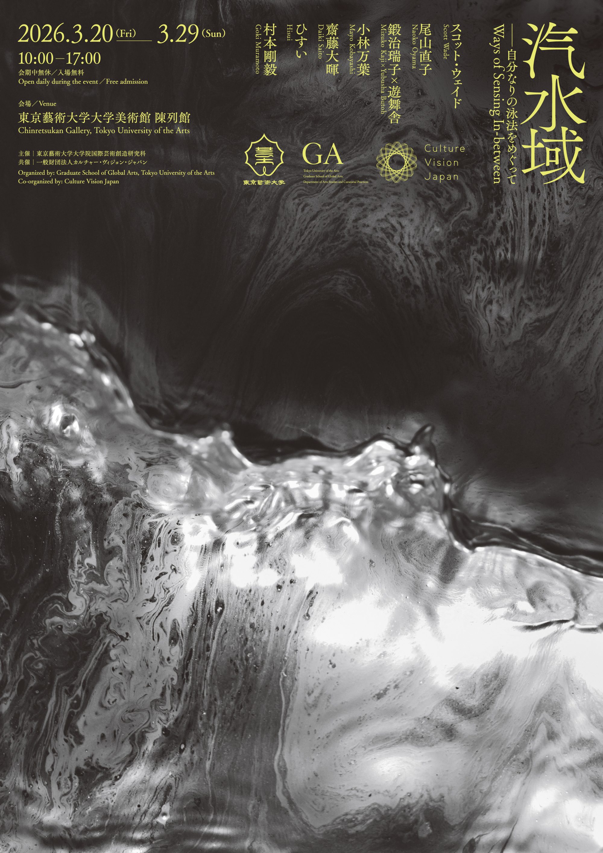 本展では、概念や意味が交差し揺らぐ、あわいを漂うための汽水域を7組の作家とつくり出します。展示空間を漂いながら、作家たちそれぞれの視点から世界を見つめ、時に戸惑い、時に共鳴する中で、観る者は自分なりの「濃度差」を感知し、進むための手応えを掴んでいくでしょう。性急に答えを求めようとするスピードに抗い、試行を重ねること。その行為こそが不確実な現代を伸びやかに泳ぐための感覚を研ぎ澄ます手がかりとなるはずです。