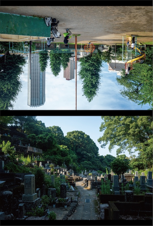 本展では、彼らの墓と新宮の風景を中心とした写真、そして丸太が主要な構成要素となっている。貯木場で浮かぶように配置された丸太の表面には切り込みが入れられ、天地が「順」と「逆」に分けられた写真が差し込まれる。展示室の床を水面と見立てるならば、私たちは水上からその光景を眺めているのか、あるいは水中から見上げているのか、その境界は次第に曖昧になっていく。同じ場所であっても、異なる方向から眺めると景色が変わるように、主体と客体のそれぞれの語りによって「事実」は幾通りにも立ち現れてしまうことを想起させるだろう。