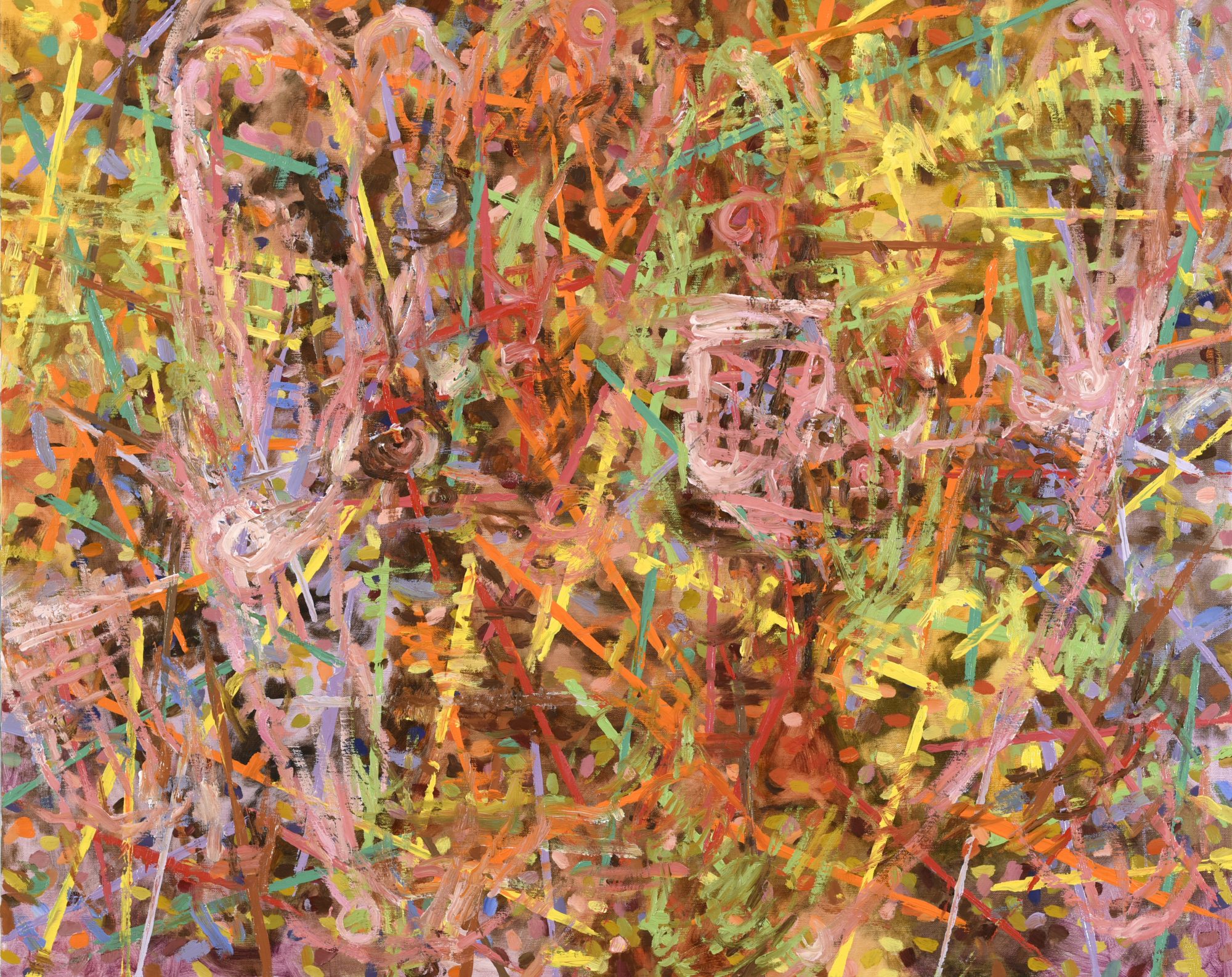 形式的には、点による像の解体と、えのぐのエロス的な物質性の回復が本シリーズの特徴になります。既存の像はまず点状の色彩によって覆われ、“ゼロ次元”へと還元されますが、そこに筆の柄による一次元的な線が介入し、二次元以上のかたちが生成され、最終段階では再び筆が用いられ、肉体に呼応するえのぐの生々しい物質感が前景化します。このプロセスは、秩序だった構築というよりも、衝突や混乱を孕んだ生成の現場として画面を開きます。