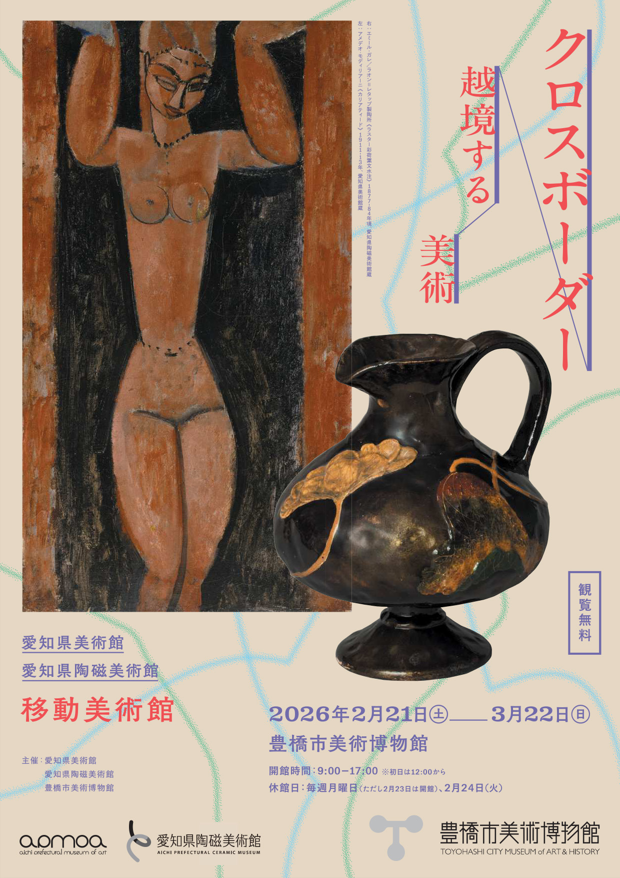 愛知県美術館と愛知県陶磁美術館は、より多くの県民の皆様に両館のコレクションをご覧いただくため、作品を県内各地に運んで展示する「移動美術館」を毎年開催しています。豊橋市で2回目の開催となる今回は、「クロスボーダー:越境する美術」をテーマに、アメデオ・モディリアーニや藤田嗣治、エミール・ガレなど、国内外の絵画や陶磁器を中心に約60点を展示します。
