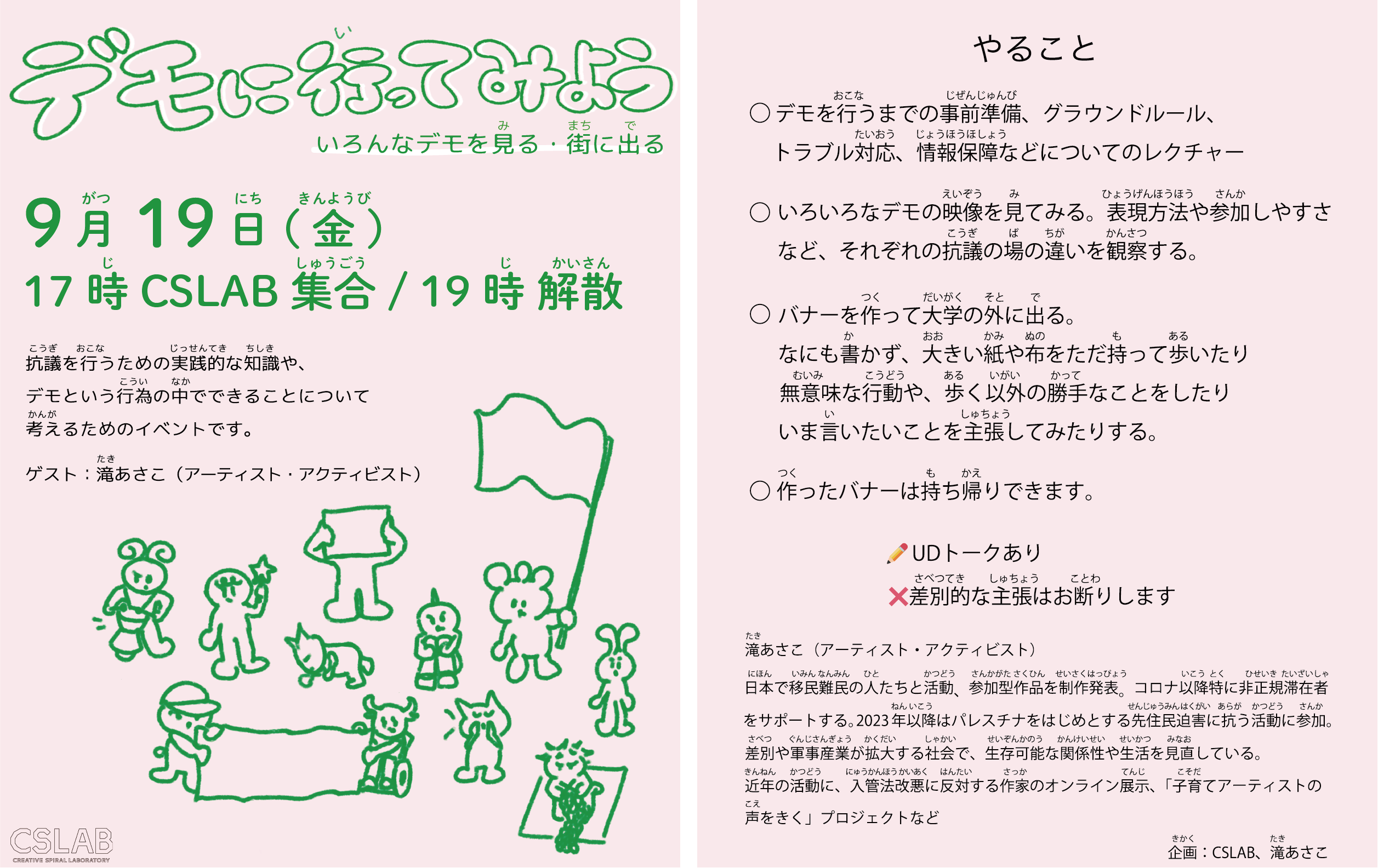 抗議を行うための実践的な知識や、デモという行為の中でできることについて考えるためのイベントです。 ゲスト:滝あさこ(アーティスト・アクティビスト) やること ・デモを行うまでの事前準備、グラウンドルール、トラブル対応、情報保障などについてのレクチャー ・いろいろなデモの映像を見てみる。表現方法や参加しやすさなどそれぞれの抗議の場の違いを観察する。 ・バナーを作って大学の外に出る。なにも書かず、大きい紙や布をただ持って歩いたり、無意味な行動や、歩く以外の勝手なことをしたり、いま言いたいことを主張してみたりする。 ・作ったバナーは持ち帰りできます。 ✏️UDトークあり ❌差別的主張はお断りします 滝あさこ(アーティスト・アクティビスト) 日本で移民難民の人たちと活動、参加型作品を制作発表。コロナ以降特に非正規滞在者をサポートする。2023年以降はパレスチナをはじめとする先住民迫害に抗う活動に参加。差別や軍事産業が拡大する社会で、生存可能な関係性や生活を見直している。 近年の活動に、入管法改悪に反対する作家のオンライン展示、「子育てアーティストの声をきく」プロジェクトなど 企画:CSLAB、滝あさこ — <デモに いってみよう いろんなデモを みる・まちに でる> 9がつ 19にち きんようび 17じ CSLABしゅうごう / 19じ かいさん 〒192-0992 とうきょうと はちおうじし うつぬきまち 1556ばんち 8ごうかん こうぎを するために じっさいにつかえる ちしきや、デモの なかで できることに ついて かんがえる ための イベントです。 ゲスト:たきあさこ(アーティスト・アクティビスト) やること ・レクチャー:デモを するまえの じゅんび、グラウンドルール、トラブルたいおう、じょうほうほしょう などについて ・いろいろなデモの えいぞうを みてみる。ひょうげんの しかたや さんかしやすさ など それぞれの デモのちがいを みて かんがえる。 ・バナーをつくって だいがくの そとに でる。なにも かかず、おおきい かみや ぬのを ただもって あるいたり、いみのない こうどうや、あるく いがいの かってな ことをしたり、いま いいたいことを しゅちょうしてみたりする。 ・つくったバナーは もちかえり できます。 ✏️UDトークあり ❌さべつてき しゅちょう は おことわりします たき あさこ(アーティスト・アクティビスト) にほんで いみん なんみんの ひとたちと かつどう、さんかがた さくひんを せいさく はっぴょう。コロナ いこう とくに ひせいき たいざいしゃをサポートする。2023ねん から パレスチナを はじめとする せんじゅうみん への ぼうりょく に はんたいする かつどうに さんか。さべつや ぐんじさんぎょうが ひろがる しゃかい で、みんなで いきていくための かんけいせいや せいかつを みなおして いる。 さいきんの かつどうに、にゅうかんほう かいあくに はんたいする さっかの オンラインてんじ、「こそだてアーティストの こえをきく」プロジェクトなど きかく:CSLAB、たきあさこ |