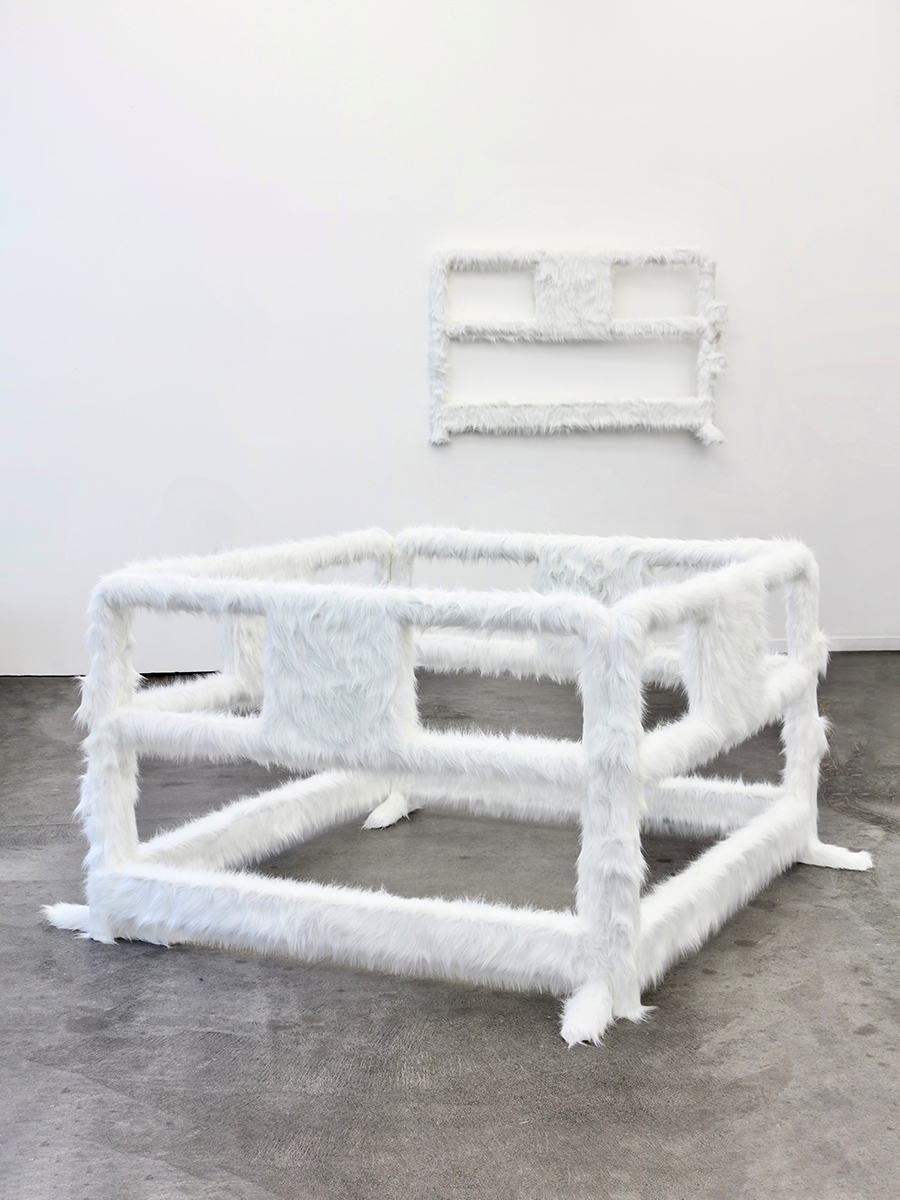 シュルレアリスムやポップ・アートといった歴史的なアートの潮流と共鳴するように、マルジェラは日常的な物体に特別な関心を寄せ、鋭い観察眼に基づいて、日々の生活の中にある素材に取り組みます。《Barrier Sculpture》では、都市の環境で一般的に見られる保護バリケードの形状が用いられていますが、奇妙なことに、それはフェイクファーで覆われています。こうした再文脈化のプロセスによって、それぞれの物体は通常の機能を超えて引き上げられ、詩的で不可解なアーティファクトとなります。この取り組みにおいてファウンド・オブジェクトは、潜在している可能性を顕在化させるレディメイドとして扱われています。マルジェラによるミニマルかつ深遠な介入は、ありふれたものを──その慎ましい起源の痕跡を残したまま──異様なものに作り変えることで、丹念な注視や循環的な更新の実践を促します。一連の作品が示すように、物体の生は直線的でも有限でもありません。それは常に、新たな文脈に置かれることで、変異と再活性化の可能性に開かれているのです。