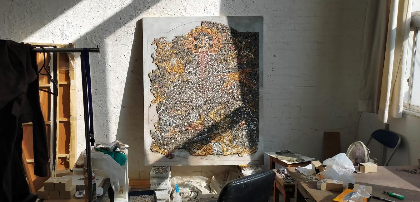 モザイクは油彩画に比べて陰影や細密な描写を持ちません。作家はその「解像度の低さ」に着目し、地域に伝わる民話や神話、伝承の曖昧さや不確かさと重ね合わせながら、作品を制作しています。