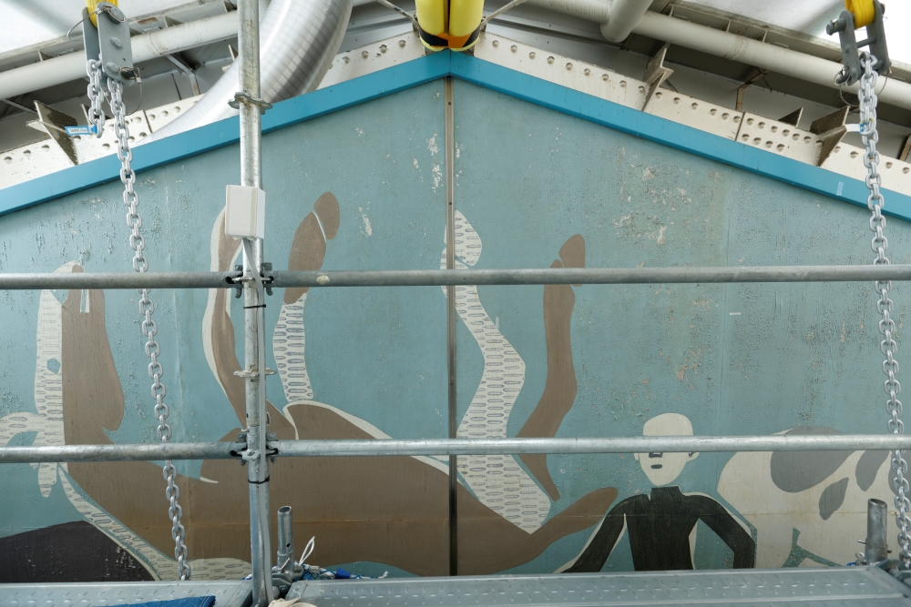 物資不足で適した材料が調達できなかった制作当時の事情と、駅という開かれた環境によって、この壁画は傷みやすく、これまで三度修復が施され、存続が図られてきました。2025 年5 月に始まった三度目の修復では壁画前に設置された「『自由』を修復しています」という横断幕が意味深長とSNSで話題になり、壁画自体も注目されました。