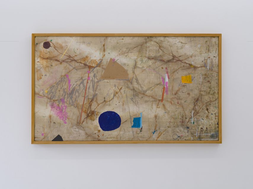 ところで、今回の出品作でもっとも気になったのが、《四季山水》(1980’s-2023)だった。これは、作家が教鞭を執っていた愛知県立芸術大学、そして東京藝術大学の研究室で使用していた作業台に新たに手を加えたものだという。絵具の飛沫が飛び散り、部分的にメンディングテープなどが貼られた平面は、経年の痕跡を宿すテーブルがそのまま即物的に作品化したような様相を呈していた。もはや、ここでの絵画は主体の能動によって仕立てられる舞台ではない。作業台みずからが絵画の近似物へと接近してゆき、画家はむしろ、受動的に「台」の空間の作品化を引き受ける立場となる。