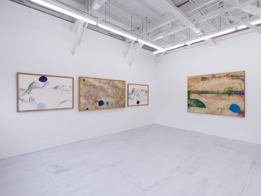 よく知られるように、櫃田は40年以上に渡って抽象化された形象による「風景」を描いてきた画家である。今回の個展には1990年代の作品から2020年代の近作までが展示されていたが、過去作と近作を織り交ぜる構成は制作年代のギャップを感じさせず、むしろ作家の一貫した「風景」への関心を物語るものとなっていた。いったん完成した作品を長い年月を経て再加筆することも多い櫃田にとって、過去作と近作はさして断絶を伴うものではないといったところだろうか。