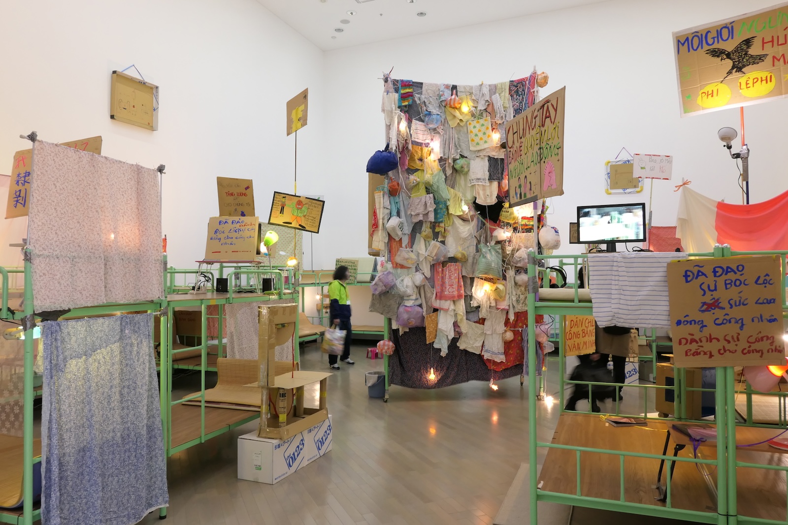 本章「わたしの解放」はグランドギャラリーを挟んで反対側にも展開している。こちらには台湾のアーティストグループ、你哥影視社(ユア・ブラザーズ・フィルムメイキング・グループ)によるインスタレーション作品《宿舎》(2023/2024)が展示されている。2018年、台湾、新北市でベトナム人女性労働者が待遇改善を訴え、寮に立て籠もり、ストライキを行なった事件のニュースに着想を得たこの作品は、その出来事を元にしたワークショップを俳優らと継続的に行ない撮影したものを2022年に映画作品として発表、各地の映画祭で賞を獲得している。今回は撮影したフッテージをワークショップに用いた家具や洋服などとともに展示、インスタレーション作品として展示した。你哥影視社はこれまでの作品でも出稼ぎ労働者の問題に深い関心を示しており、メンバーのひとり、蘇玉仙は実際の出稼ぎ労働者に自ら得た助成金を通じて支払いをする方法を考案、実践したこともある。また、你哥影視社としても、対話や委託労働、ワークショップなどを通じて彼らと関わり続けている。本作は、ストライキ中のベトナム人女性たちがFacebookを通じて彼女たちの宿舎からライブ配信した映像が、ストライキの様子だけではなく、日常生活を映し出し、皆が集う場所になっていたことにインスピレーションを得ている。制作手法としては、ベトナム人女性労働者や、台湾人の配偶者となった外国人らに声をかけ、彼女たちとのワークショップを繰り返しながら内容を詰めていき撮影に至るという方法をとっており、その撮影プロセスを重視。彼女たちの宿舎と同じような場所を再現するために、工業地帯の廃棄工場を借り、平日は二段ベッドを含めたプラスチックの家具をリサイクルセンターからメンバーが拾って持ち込み、週末は人を集めてワークショップを開催することを繰り返すうちに、泊まり込みで過ごしたこともあってか、借りた廃工場のスタジオがあたかも配信されていた場所と同様に生活の場として変容していく。ワークショップでは、合理的なストライキの方法や、実際起こっているベトナム人労働者についてのストライキについて話し合うことや、元となったベトナム人女性のストライキの映像を見て話し合うことなどが行なわれた[8]。富山妙子の作品が、慟哭や悲しみを感じさせ、緊張感が漂うのに対して(撮影禁止だったことも影響しているかもしれない)、こちらは元の出来事も、ストライキ運動だけに限らない日常生活の場がダダ漏れになって配信されていたことと類似して、実際の生活環境としては決して快適ではないはずなのに、何か緩やかで温かみがある空間になっており、ベトナム人労働者の女性たちの苦しみがやや伝わりにくいように思えた。彼女たちが置かれた状況は、実際には「解放」とは程遠いことは想像に難くない。しかし、ここ、美術館内に設置された場は、皮肉にも何かコミュニティとして居心地の良い空間のように見えてしまうのだ。さらにその外側の壁に展示された、丹羽良徳の作品群は、ほぼひとり遊び、ごっこ遊びの様相で、自己解放ではあるかもしれないものの、富山が人生をかけて背負い続けているものとは程遠い極めて表層的で軽薄なものである。