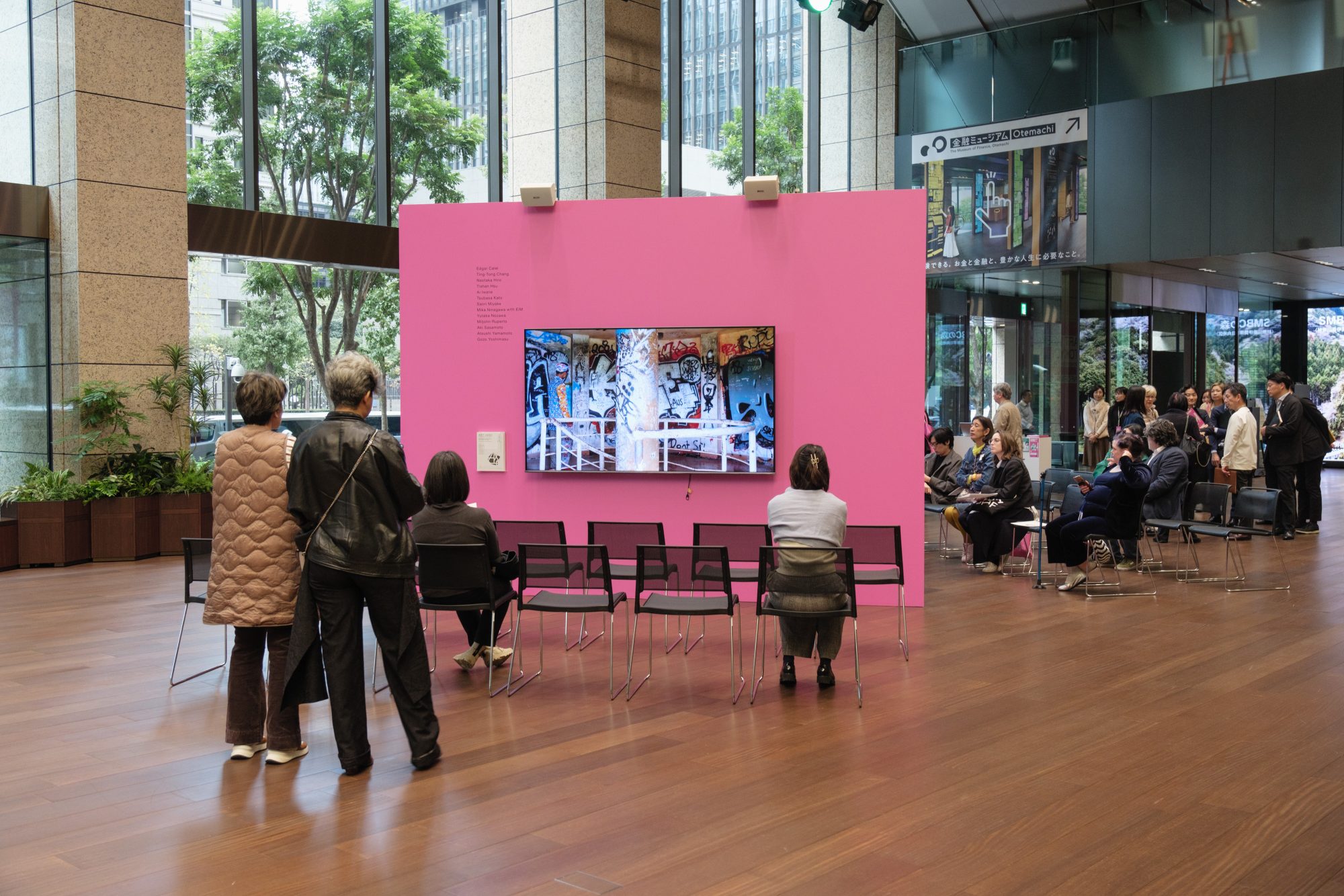 2024年度のAWT VIDEO「飛行機雲か山脈か」展示風景(三井住友銀行東館、東京) 監修:ソフラブ・モヘビ Courtesy Art Week Tokyo