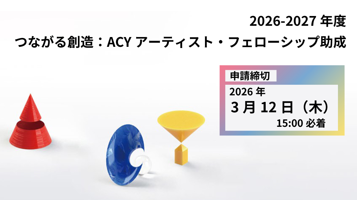 申請にはポートフォリオなどに加え、推薦状が必要となる。対象者は美術、舞台芸術の分野で活動するアーティスト個人で、過去にACYの助成プログラムで申請者として採択されたことがないこと、日本語でのコミュニケーションが可能であることが応募条件となる。採択者は専門家により独自性・地域性に重点を置いた書類選考(一次)および面談選考(二次)を通じて選ばれる。最終結果は2026年5月14日までに、すべての申請者へメールで通知される。詳細は公式ウェブサイトを参照。なお、申請に関する説明動画がACY公式YouTubeで公開されている。