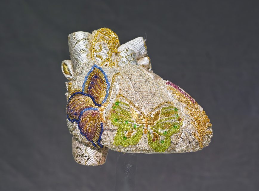 岸かおる(1956年広島県生まれ)は、女性の在り方や生き方、人の生老病死の問題から、国家、イデオロギー、戦争、核開発、環境問題と幅広いテーマに取り組んでいる。京都工芸繊維大学を卒業と同時に結婚して子育てに専念した岸は、2009年に50代で広島市立大学大学院に入り直し制作活動を開始、専業主婦の時代に培った料理や裁縫といった技術を利用した制作を行なう。近年の主な展覧会に「カナリアがさえずりを止めるとき」(広島市立大学芸術学部CA+Tラボ、2020)、「彼女たちは叫ぶ、ささやく -ヴァルネラブルな集合体が世界を変える」(東京都美術館、2019)、個展「連」(ギャラリー交差611、広島、2018)がある。