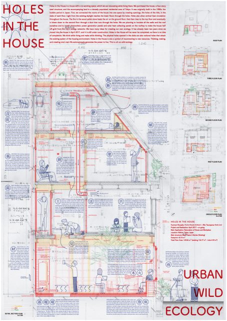 本展では、「西大井のあな」改修の記録とさらなる改修案、能作、常山それぞれのプロジェクトや、最新作「秋谷の木組(秋谷スマートハウスE棟)」をはじめとする共同のプロジェクトの断面図や模型、TOTOギャラリー・間の中庭に学生とともに自主施工した「タイニーハウス」などを通じて、網目をつなぎ直すために誰もが真似できる小さな試行錯誤の共有を試みる。(展覧会コンセプト「都市菌(としきのこ)――複数種の網目としての建築」)