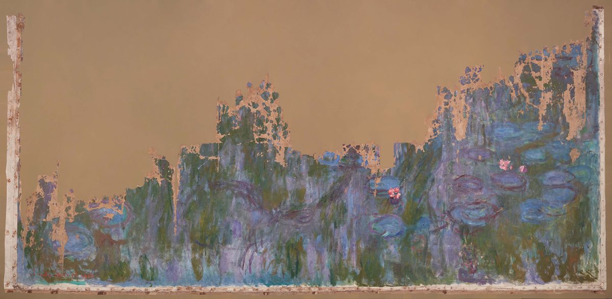 竹村京《修復されたC.M.の1916年の睡蓮》(部分、制作過程)2023-24年、釡糸、絹オーガンジー、カラープリント、作家蔵 クロード・モネ 《睡蓮、柳の反映》1916年 油彩、カンヴァス 国立西洋美術館 松方幸次郎氏御遺族より寄贈(旧松方コレクション)