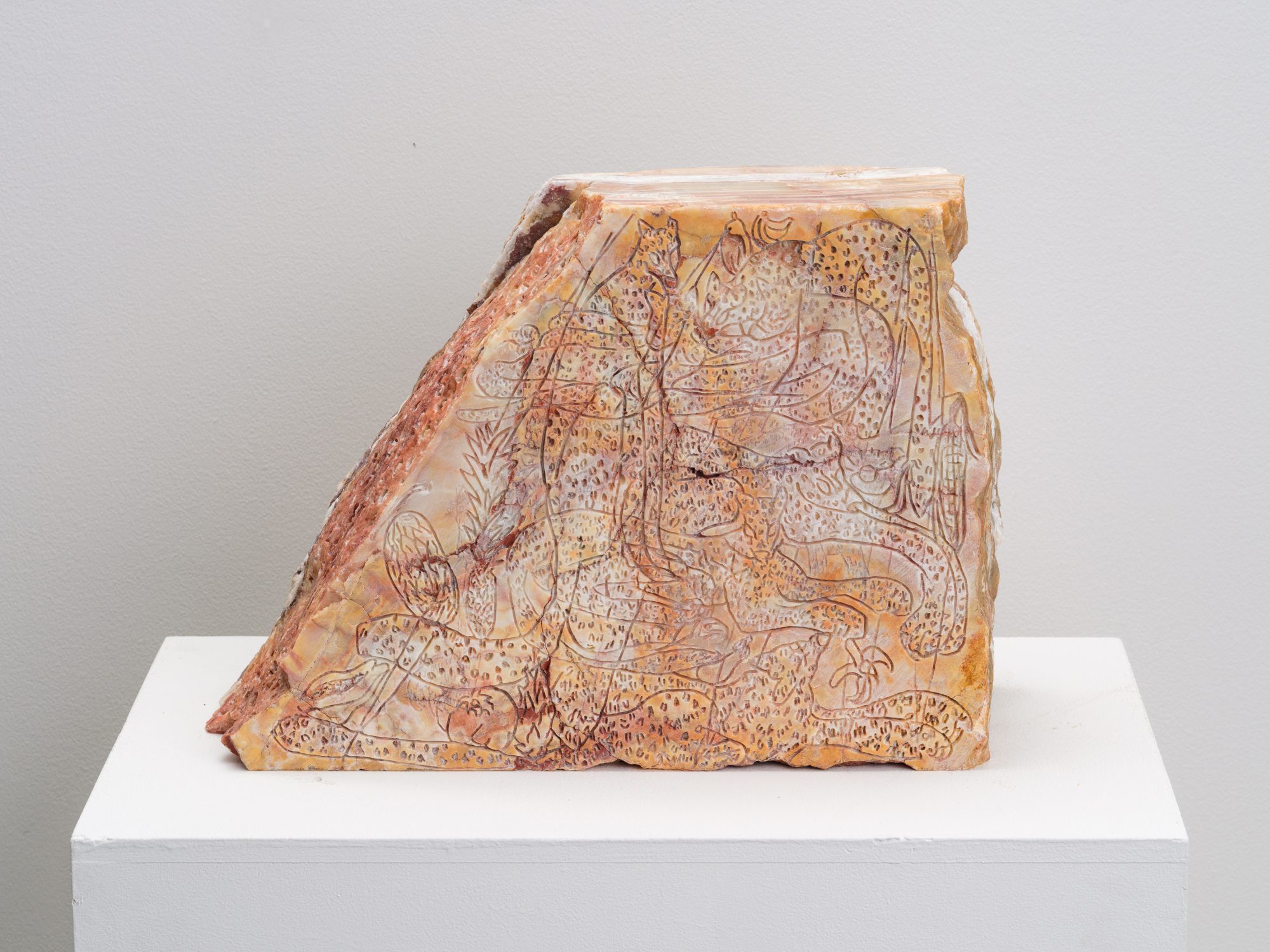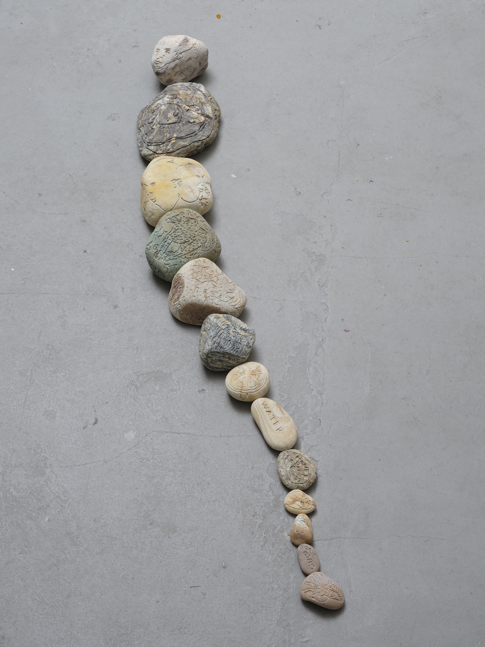 本展では、絵具や線のダイナミックな流れ、その大きな世界の中に息づく小さな食物や動物等の作品群が、個でありながらもひとつのインスタレーションのような空間を構成。川内は、小さな作品を組み合わせてひとつの大きな絵のように見せる試みや、個々の石彫が繋がり蛇のようになった新作《snake》など、一と多を行き来するような新たな表現や見せ方にも挑戦する。