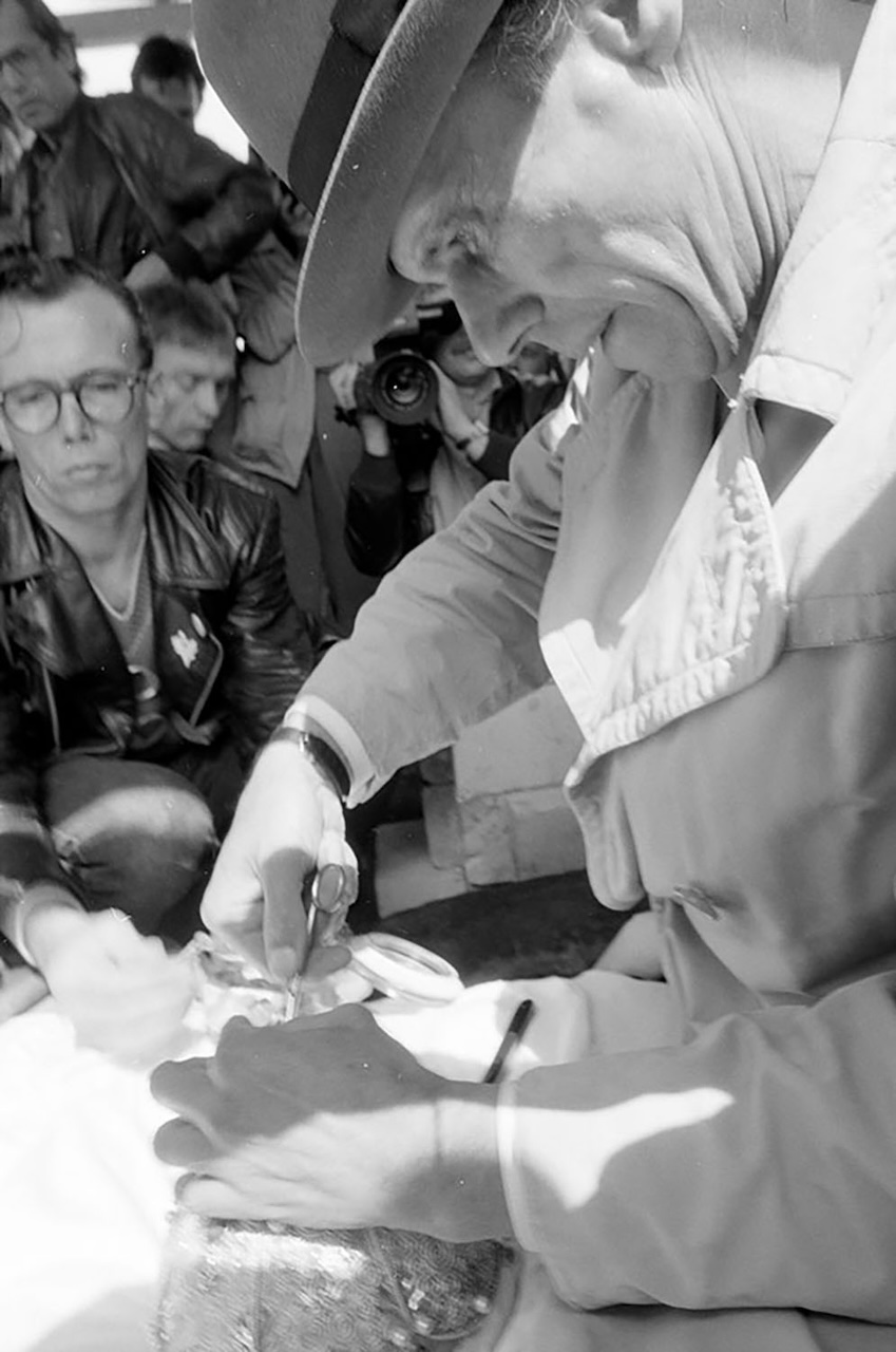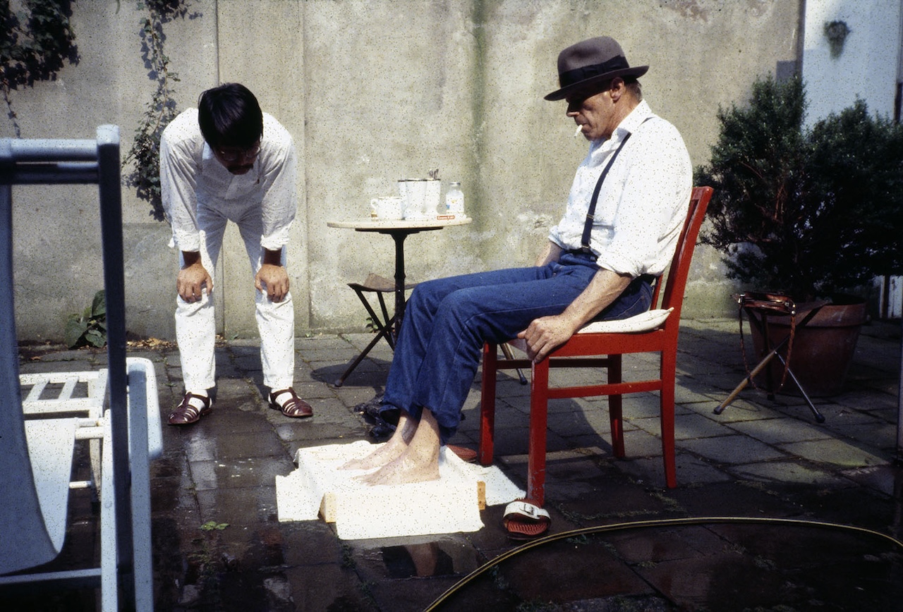 「ヨーゼフ・ボイスの足型を取る若江漢字 デュッセルドルフ、ボイスのアトリエの庭 1983年7月16日」撮影:若江栄戽