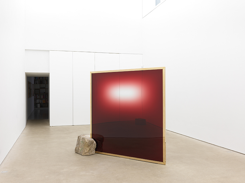 和田礼治郎《スカーレット・ポータル》2020年 ワイン、強化ガラス、真鍮、ステンレススチール、大理石、180×220×60 cm 展示風景:「Embraced Void」ダニエル・マルツォーナ(ベルリン)、2020年 撮影:Nick Ash