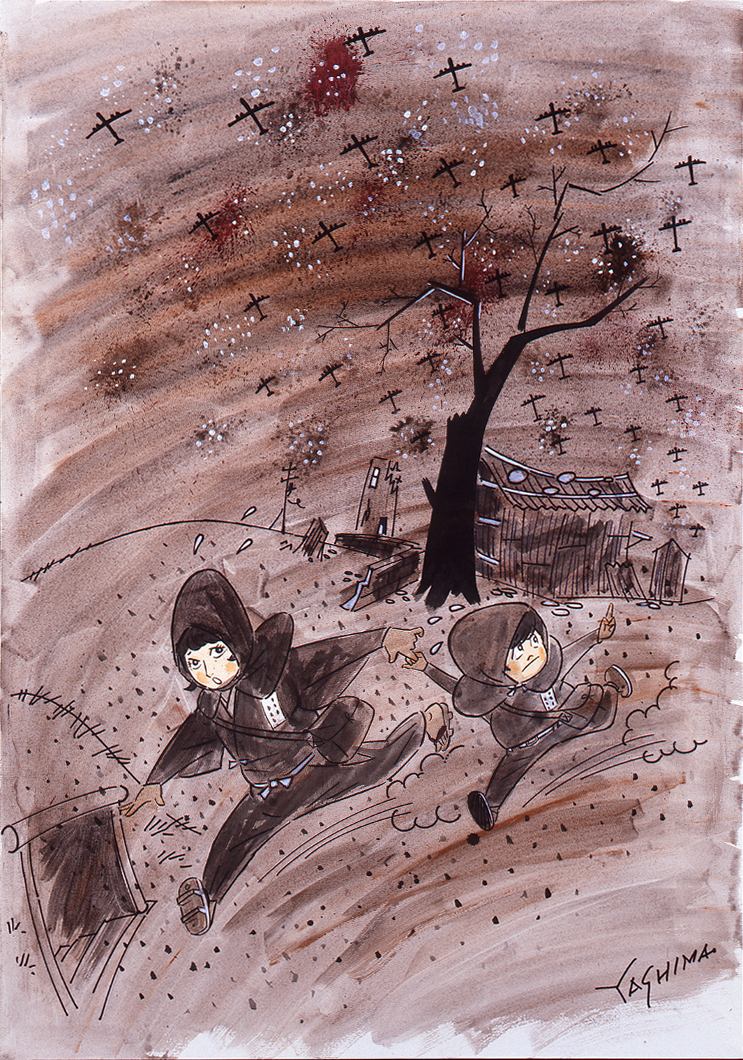 八島一夫《横浜大空襲500機 [450まで数えられるってどうでもよいのよ早く逃げて]》1978年 マジック、水彩、紙 102.7×72.4cm 横浜市民ギャラリー所蔵