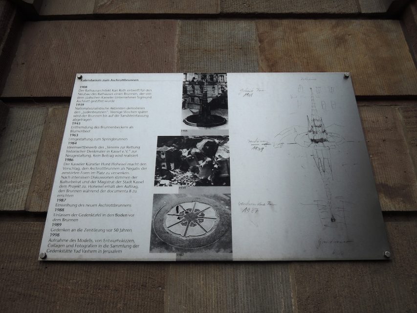 カッセル市庁舎前のアシュロットのモニュメントを倒立させた自作の前で、解説するホルスト・ホーハイゼル。手にしているのは、アシュロットのモニュメントの写真。上はモニュメントの銘板。