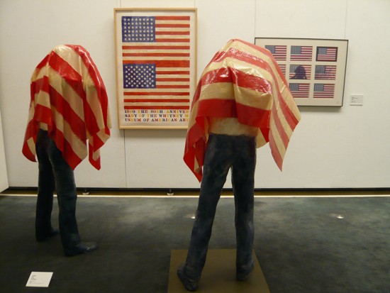 手前: 小島信明「立像」(1990)、左: ジャスパー・ジョーンズ「二つの旗」(1980)、右: 森村泰昌「On Photographs Vol-3」(1981)カタログ『まねぶ美術史』は赤々舎より発行。